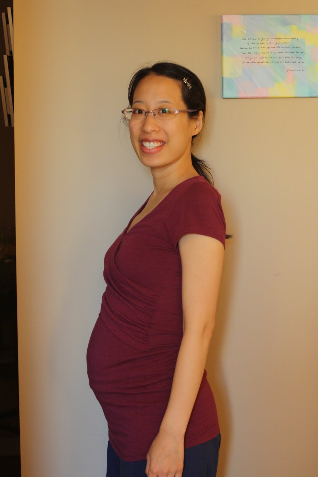 I have to admit though, having been stick thin for most of my life, seeing my tummy protrude more and more is taking some adjustment. It’s hard not to think I’m getting fat. I do have a couple sources of comfort though: T says he loves my belly; and ultimately, God is watching over how I grow – and God makes beautiful things.